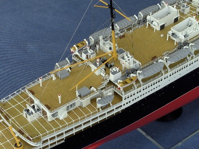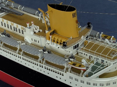 „ ANDREA DORIA“ Modell II Modellbau Ende 2006 - Mitte 2009 Unterlagen Detaillierte Pläne und Bildmaterial aus dem Internet. Eigene Austragung des Rumpfes mit Spantenkonstruktion: Ausfertigung Maßstab: 1:220 Reines Standmodell; Rumpf: 48 Spanten und Beplankung Sperrholz, 1mm; Aufbauten, Schornstein: Sperrholz, 1mm; Anbauteile: Holz, Sperrholz; Reling: 0,3/ 0,5mm Cu-Draht, handgelötet (Vorrichtung) Takelage: Edelstahlseil 0,38mm Verbleib Eigenverbleib