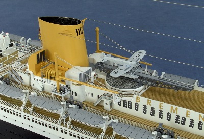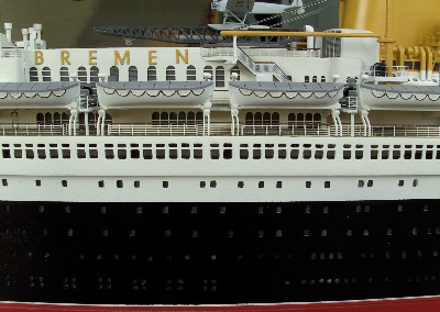 „BREMEN“ IV Modell Modellbau A 2010 - A 2012 Unterlagen Bauplan-Basis: Modellbaubogen „Bremen“ Scheuer & Strüver, Nutzung der Ätzteile Ausfertigung Maßstab: 1:250 Reines Standmodell Rumpf: Spanten, Sperrholz 2mm; Beplankung, Sperrholz 0,5mm Aufbauten, Schornstein: Sperrholz, 0,5 u. 1,0 mm; Anbauteile: Holz, Sperrholz; Reling, Treppen, Kleinteile: Ätzteile Takelage: Edelstahlseil 0,38mm Davids: Eigenkonstruktion: Kunststoff-Laserteiele Unterwasserrumpf: Schichtbauweise Verbindung per Bolzenführung Verbleib Eigenverbleib
