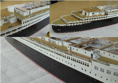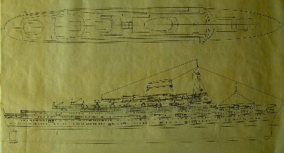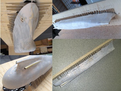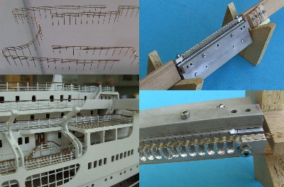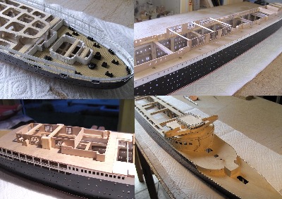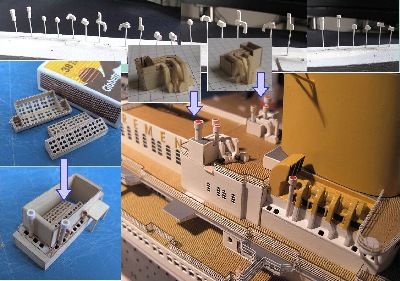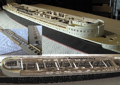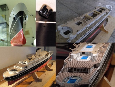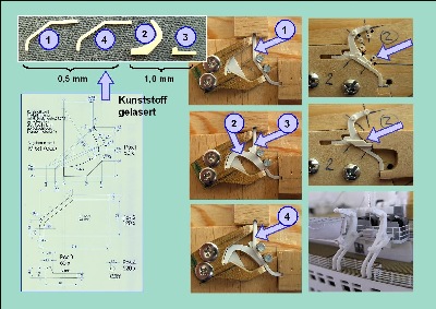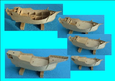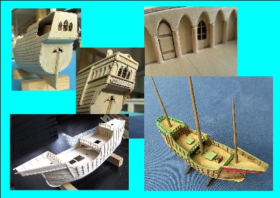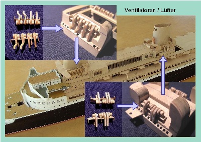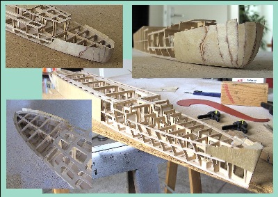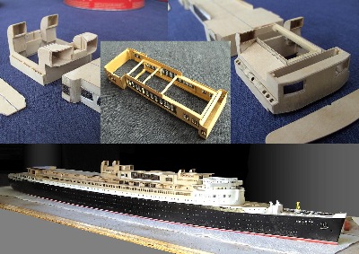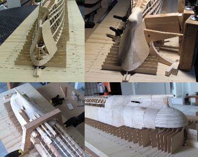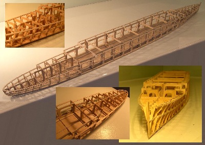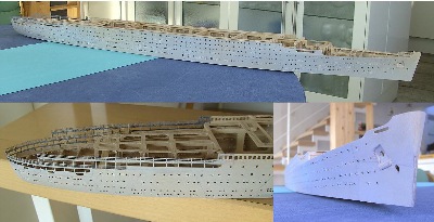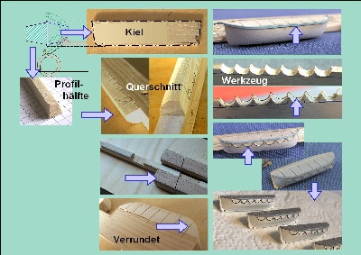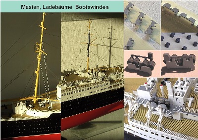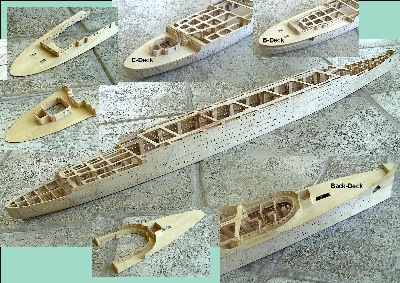 Das Modell wurde von vornherein als reines Standmodell konzipiert. Als Plangrundlage fungierte der Karton-Modellbaubogen „BREMEN“ der Firma Scheuer § Strüver GmbH bearbeitet durch den Konstrukteur Peter Brandt. Die Bauteile wurden auf die Wandstärken der verwendeten Hölzer angepaßt. Die hierfür verfügbaren Ätzteile wurden zum größten Teil in Anspruch genommen. Der im Modellbogen nicht vorgesehene Unterwasserrumpf wurde in Schichtbauweise separat gefertigt und ist zum Zwecke der Zugänglichkeit zum Modellinneren trennbar. Die Einzelteile der Davids wurden vermaßt, mit Laser aus Kunststoff geschnitten und in zwei kleinen Vorrichtungen komplettiert.